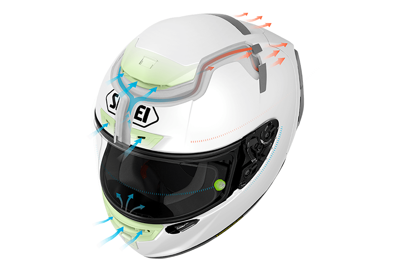 Shoei’s ventilation systems directs cooling, drying air into the helmet, and use areas of low air pressure to the rear of the helmet to draw warm, damp air through the exhaust outlets and into the outside environment. A high priority feature/function during the R&D and testing phases of new helmet development, Shoei utilises its state-of-the-art wind tunnel to maximise ventilation performance. The perfect placement and shaping of the inlets and outlets, along with air channels created within the EPS liner, are the basis for optimum ventilation, and is part of what separates Shoei from our competition.