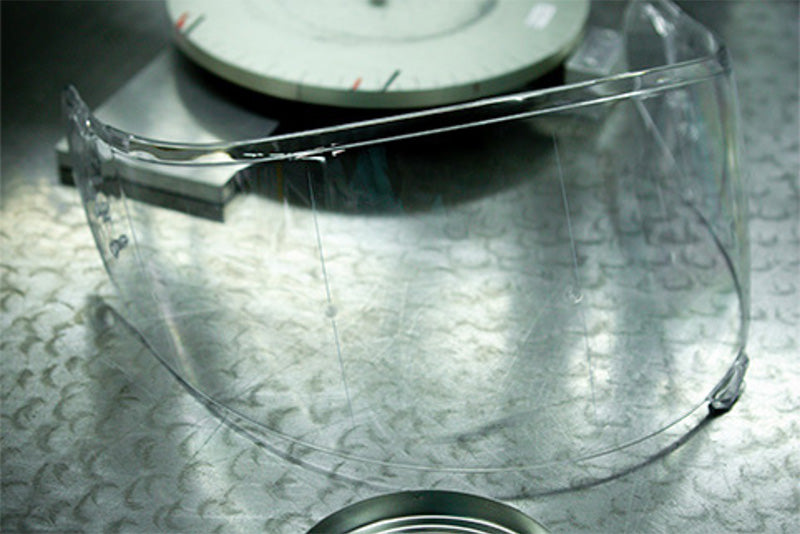 All current model Shoei shields are made from high-strength polycarbonate using a sophisticated 3D injection molding process. Although this method is more expensive, it is necessary to create a 3-dimensional curved shield that is optically correct to eliminate any distortion. Injection molding also allows Shoei to form the mounting apparatus that work together with Shoei’s quick-release base plate systems, allowing for quick and easy tool-less shield changes. In contrast, some manufacturers are forced to use turbulent base-plate covers because they cannot produce 3-dimensional shields using the “stamping” method.